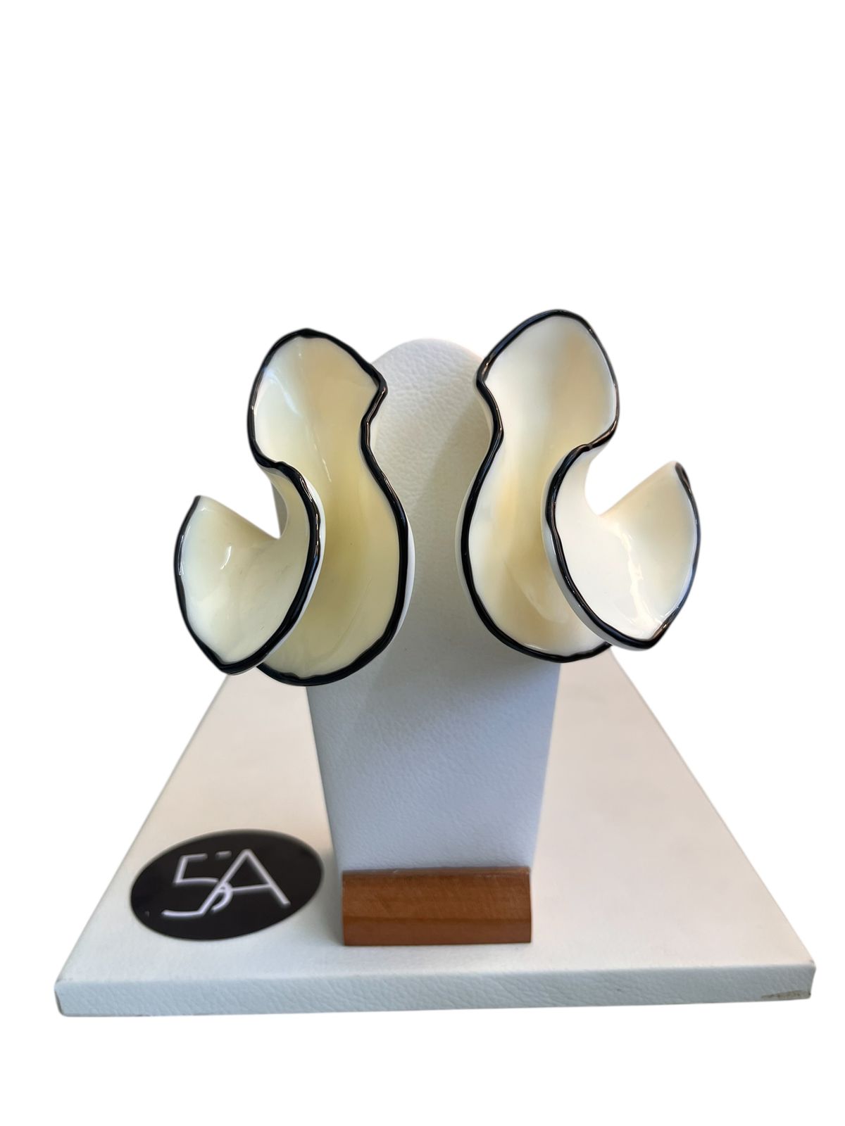 Aros de diseño escultórico y moderno, con formas orgánicas irregulares que evocan arte y movimiento. Realizados en tono marfil translúcido con borde negro contrastante, ideales para quienes buscan una pieza sofisticada y distinta.