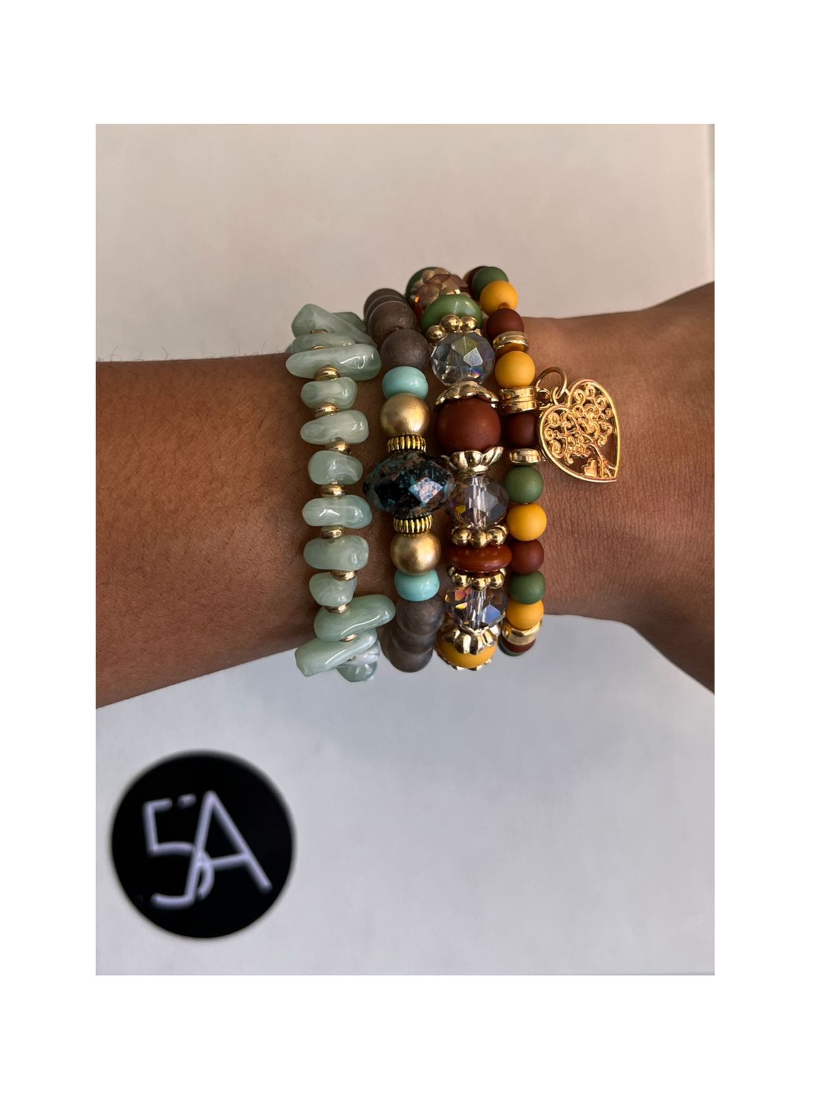 Set de pulseras artesanales con una armoniosa combinación de piedras, cuentas de vidrio y detalles dorados. Sus tonos naturales —verdes, tierra y mostaza— aportan un estilo cálido y sofisticado, ideal para usar juntas o combinarlas con otros accesorios.