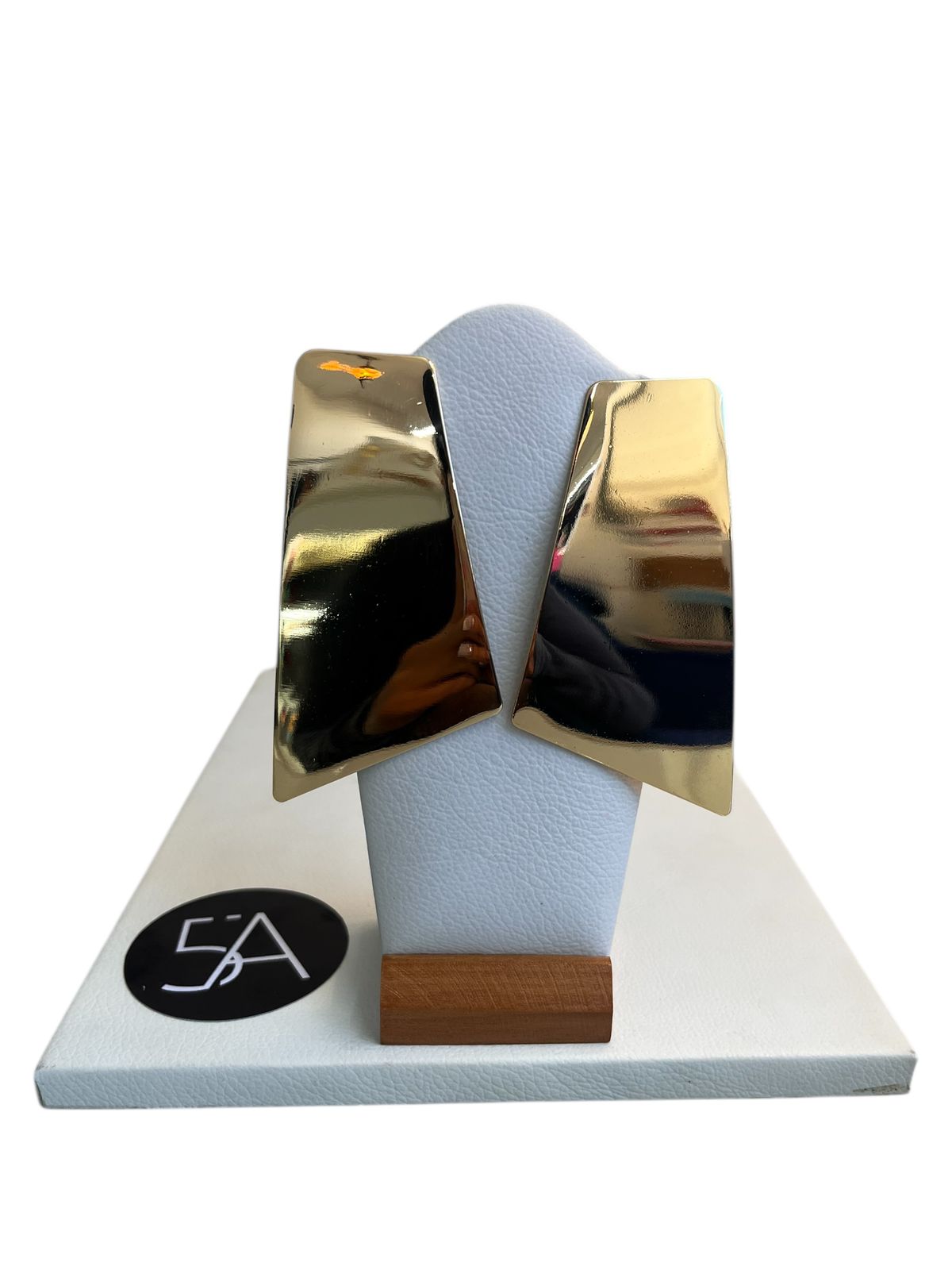 Aros de diseño geométrico irregular, con líneas curvas y un formato alargado que estiliza el rostro. Su acabado dorado brillante tipo espejo refleja la luz y aporta un look moderno, sofisticado y muy actual.