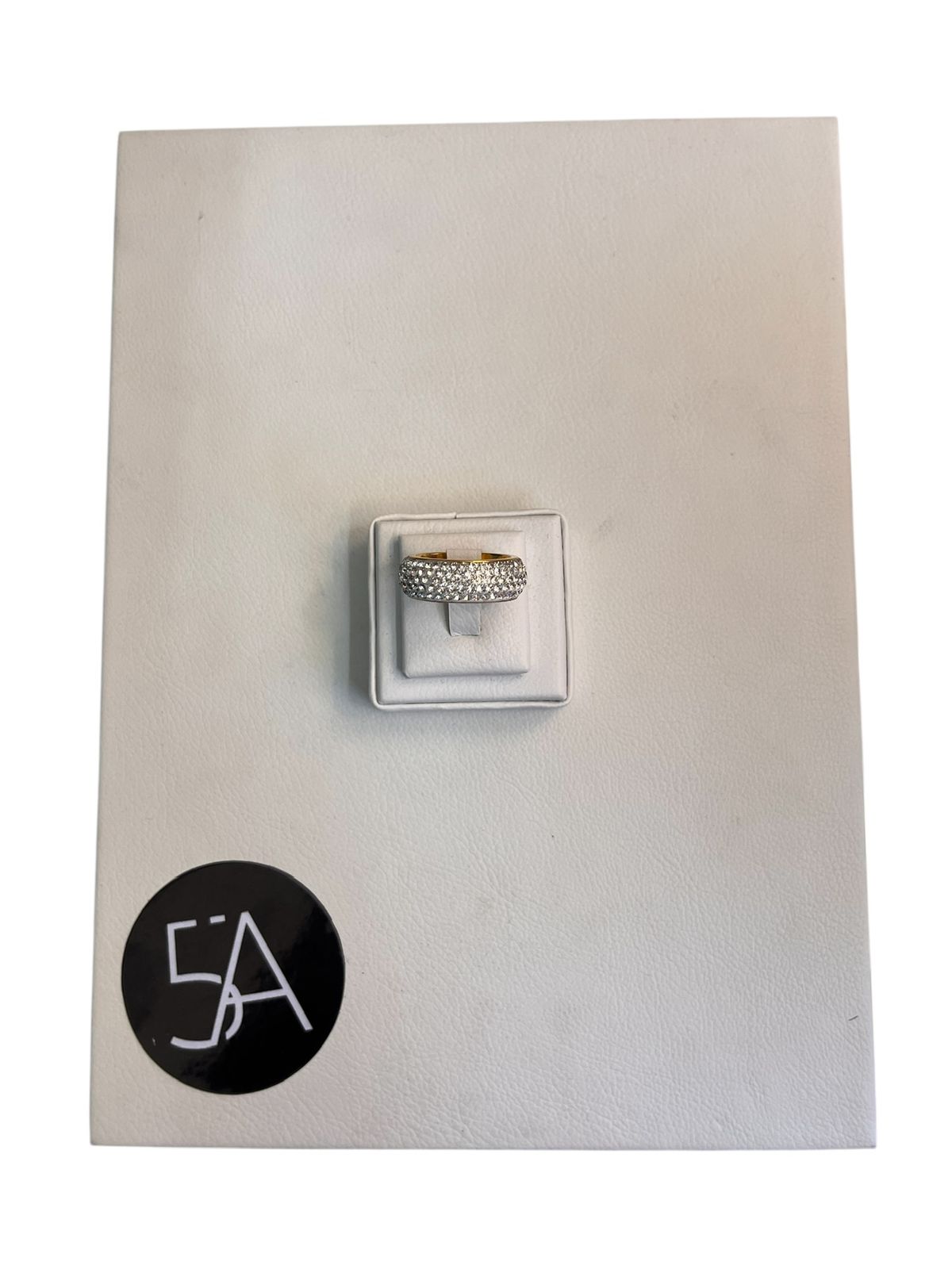 Anillo enchapado en oro de 18k con diseño tipo banda ancha, completamente cubierto de pequeños cristales que aportan un brillo uniforme y elegante. Su estilo sofisticado y atemporal lo convierte en una pieza ideal para usar sola o combinar con otros anillos. Perfecto para ocasiones especiales o para dar un toque de lujo al uso diario.
