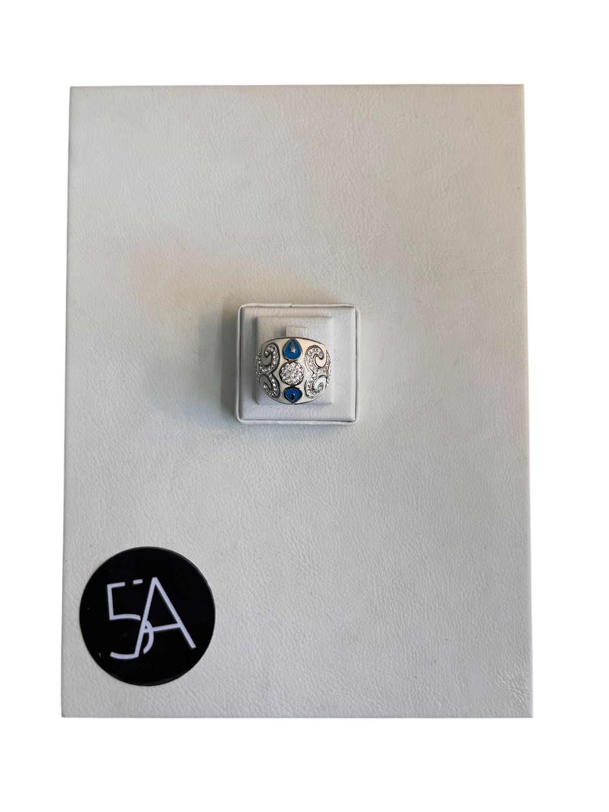Anillo de plata de diseño ornamental con delicados detalles en esmalte azul y una circonia central que aporta brillo y elegancia. Su estilo sofisticado y atemporal lo convierte en una pieza protagonista, ideal para elevar cualquier look, tanto de día como de noche.