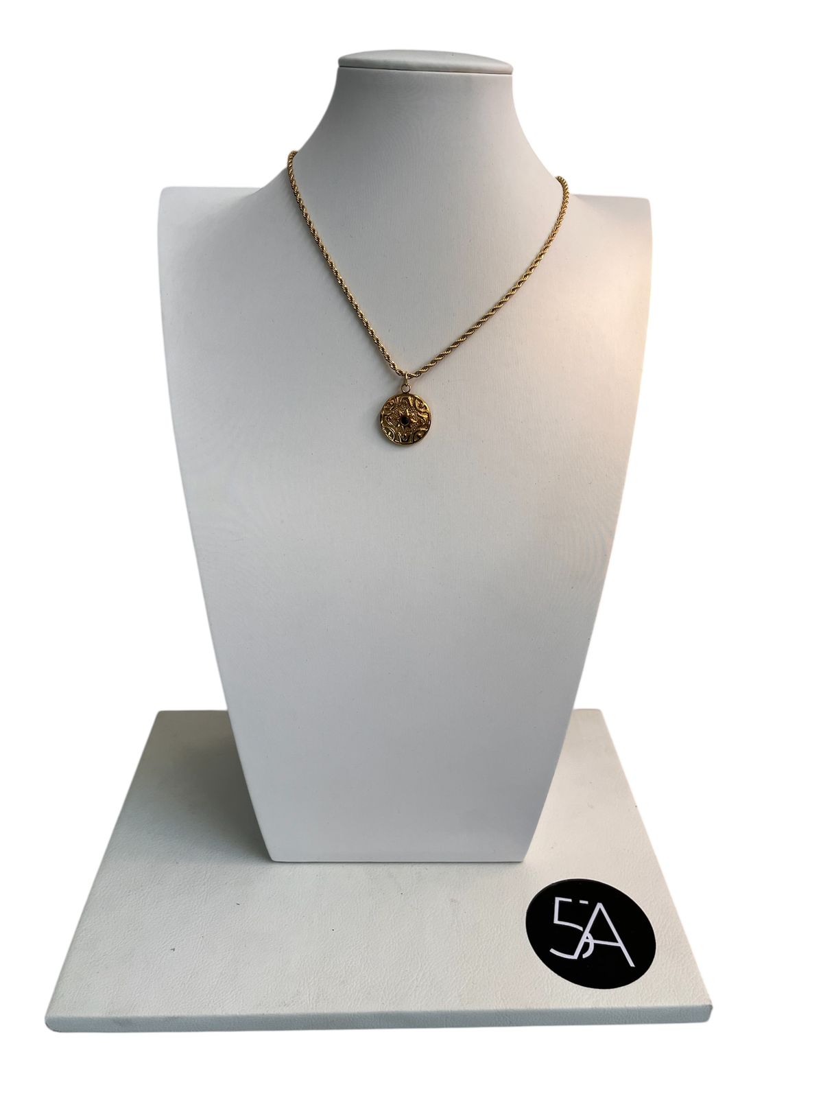 Una joya de inspiración clásica que rinde homenaje al arte del detalle. Este collar presenta una cadena de acabado dorado que sostiene un medallón finamente trabajado, donde el relieve y la textura crean un juego de luces sutil y sofisticado. Enchapado en oro 18k.