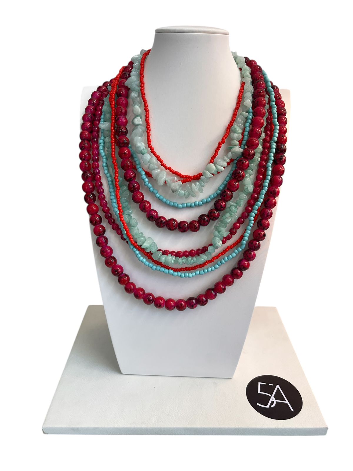 Una explosión de color diseñada para destacar sin pedir permiso: capas de cuentas cereza intensas se combinan con turquesas suaves y acentos coral que añaden energía inmediata. La mezcla de texturas y volúmenes crea un efecto dinámico y luminoso.