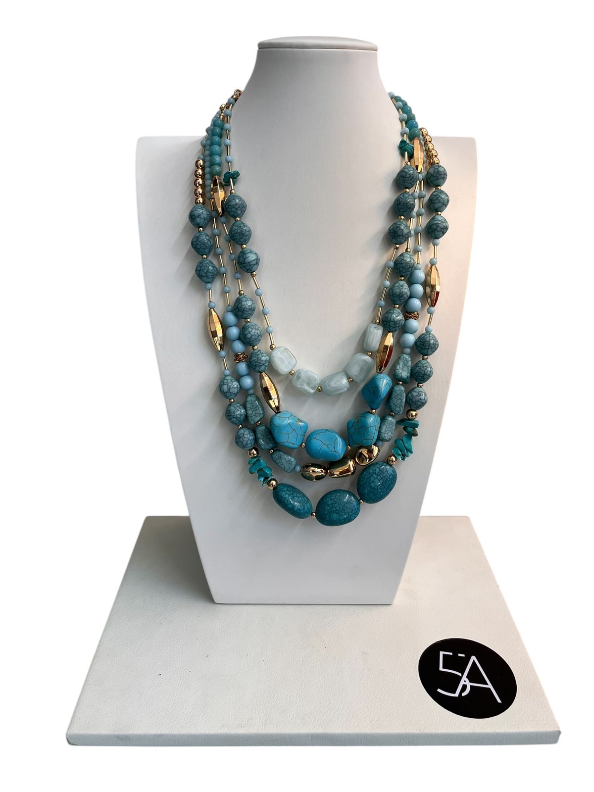 Collar largo de varias vueltas con cuentas en tonos turquesa y celeste, combinadas con detalles dorados. Diseño llamativo y elegante, ideal para realzar looks simples con un toque sofisticado y artesanal.